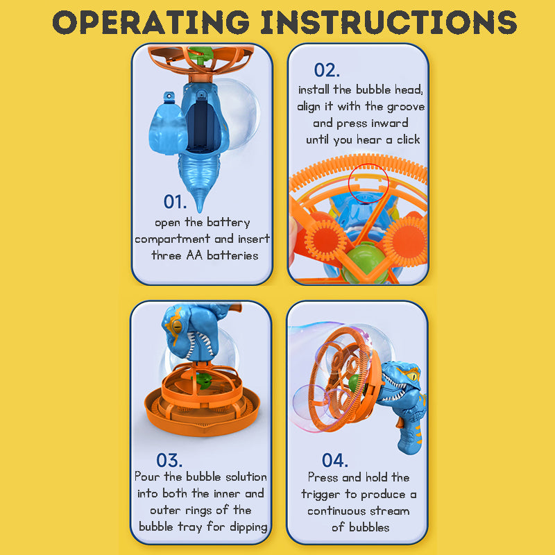 - The products produce a large volume of bubbles; please be aware of the dripping bubble solution when bubbles burst.