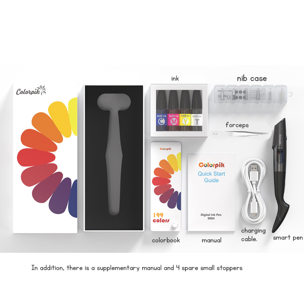The product includes: smart pen x1; charging cable x1; tweezers x1; a set of ink x1; instruction manual x1; Supplementary manual x1; Box of pen tips x1; Spare plug x4; Color card x1
