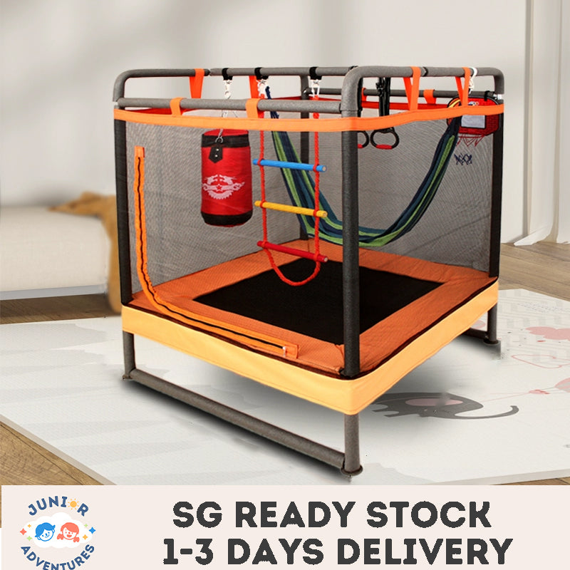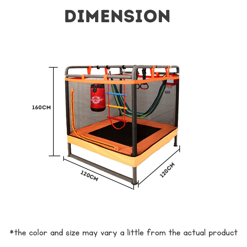 Includes: trampoline *1, climbing ladder *1, rings *2, hammock *1, basketball hoop *1, sandbag *1