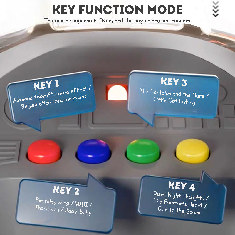 - Four buttons on the toy plane for different sound effects and Mandarin music.